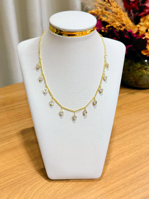 Colar folheado em ouro com delicados pingentes em formato de coração cravejados com pedras brilhantes. Uma peça romântica e sofisticada que transmite leveza e elegância, perfeita para quem gosta de acessórios charmosos e delicados.