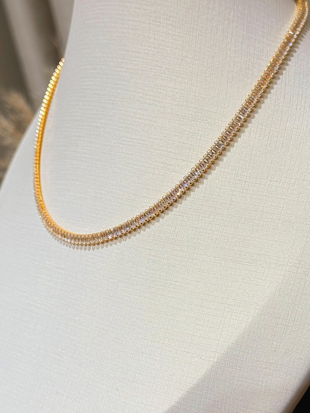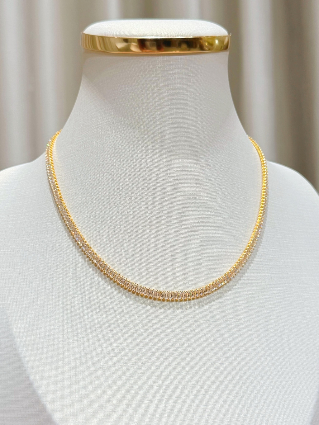 Elegante e sofisticado, o colar Riviera é folheado em dourado e adornado com zircônias em toda a extensão, proporcionando brilho intenso e um toque refinado ao visual. Perfeito para ocasiões especiais ou para dar um charme extra ao look do dia a dia.